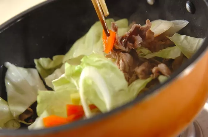 1、フライパンにサラダ油を中火で熱し、豚肉を炒める。さらにすべての野菜を加えて炒め合わせ、全体に炒められたら、うどんと<調味料>を加えて炒める。