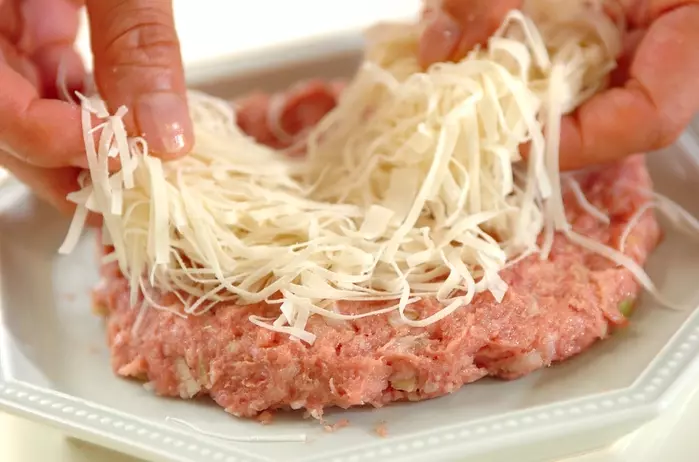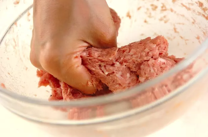 <作り方>1、ボウルに豚ひき肉、<調味料>の材料を加えて混ぜ、粘りが出てきたら白ネギとショウガを加えてさらに混ぜる。