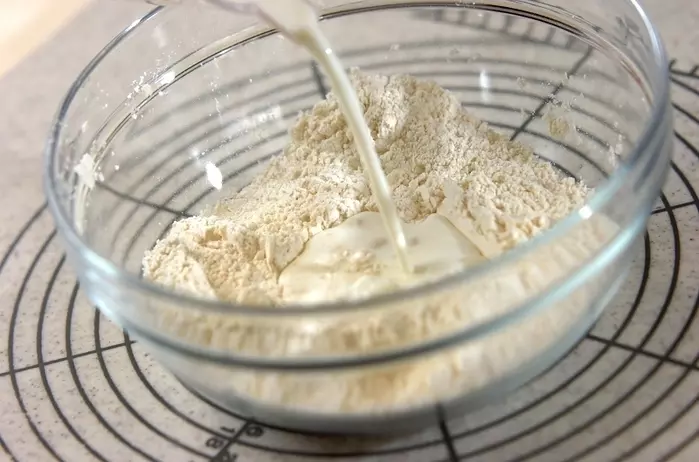 1、強力粉、薄力粉、砂糖、塩をボールに入れ、よく混ぜあわせる。粉の中央を窪ませて、牛乳とドライイーストを入れる。インスタントドライイーストと牛乳を馴染ませながら、ひと塊になるように周りの粉を少しずつ混ぜあわせる。