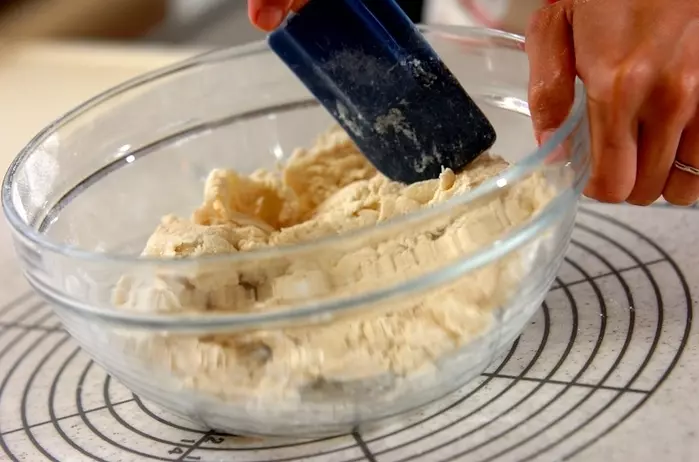2、ひとかたまりになるまでボールの中で混ぜあわせる。まとまってきたら台の上に出す。