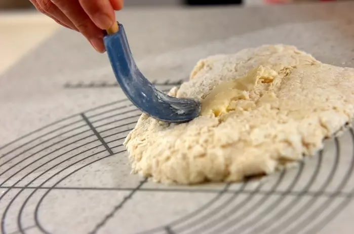 3、生地を手でのばし、数回に分けて無塩バターをぬり付ける。周囲の生地を折りこむようにこねて、無塩バターが生地全体に馴染むようにする。
