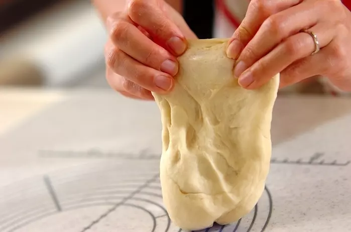 4、生地の一部を両手でのばし、向こう側が透けて見えるくらいになったらこね上がり。