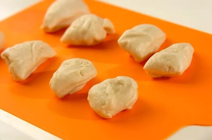 5、生地を丸め、薄くサラダ油をぬったボウルに入れてラップをし、生地が2.5倍にふくれるまで温かいところで一次発酵させる(約60分)。ボウルをあけて台に取り出し、生地の重量を計り、スケッパーで8等分する。