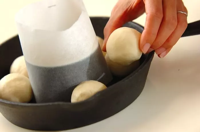 7、スキレットの中央に小さめのカップなどを置いて、その周りに丸めた生地を置く。袋などをかぶせて二次発酵(オーブンの発酵機能などで40~50分)。