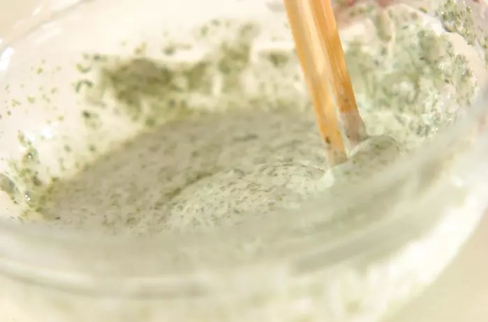 ・<衣>の材料をよく混ぜあわせ、トロンとした状態に水加減を調整する。