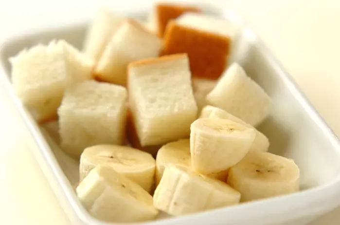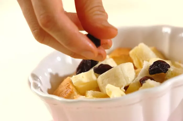 2、食パンとバナナを(1)にひたしながら加え、全体になじんだらバターとレーズンをのせる。