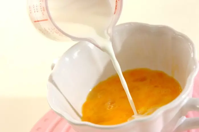 1、<卵液>を作る。マグカップに卵と砂糖を入れてよく混ぜ、牛乳を2回に分けて加え、さらによく混ぜる。