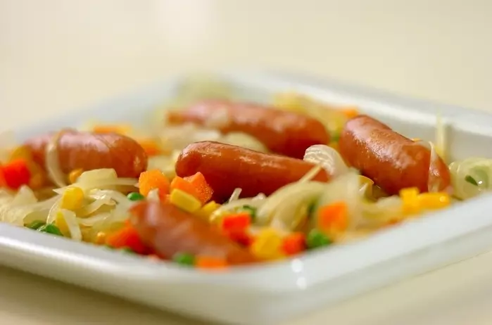 1、フライパンに分量外のオリーブ油を入れて火にかけ、玉ネギを入れて炒める。しんなりしてきたら、ミックスベジタブル、ソーセージ、塩を加えさらに炒める。バットにあけて冷ます。