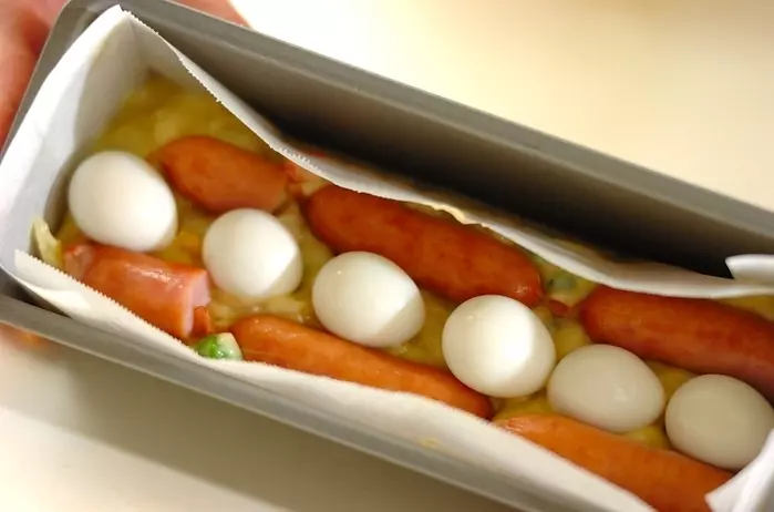 3、(1)のソーセージ以外を(2)に加えて混ぜる。パウンド型に生地の半量を入れたらソーセージを2本ずつ2列とウズラの卵を1列に並べ、残りの生地を流し入れる。