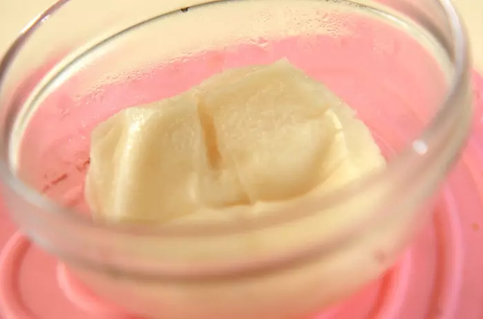 ・お餅は水にくぐらせ、耐熱容器に入れる。分量外の水小さじ1を加え、電子レンジで30秒加熱する。裏返し、さらに膨らむまで10秒ほど加熱する。