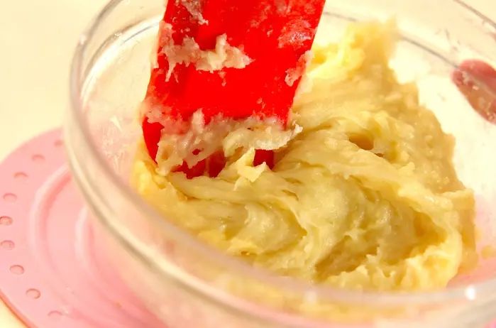 2、片栗粉を加えて混ぜ、手に打ち粉(分量外の片栗粉)をつけて、1/6量ずつ丸く広げる。カマンベールチーズを包み、厚さ2cmになるようにつぶす。