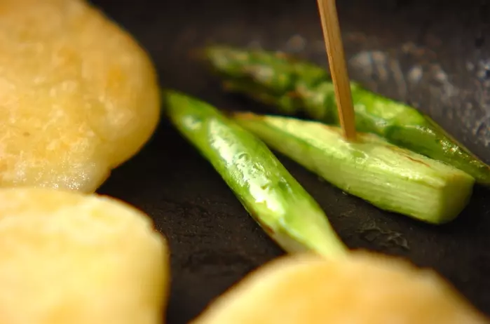 3、フライパンにサラダ油を入れて、グリーンアスパラ、<ポテトチーズ餅>を中火で4分ほど焼く。グリーンアスパラは竹串が刺されば取り出し、分量外の塩を振る。