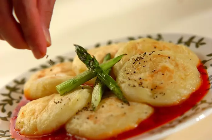 4、トマトソースは耐熱容器に入れ、ラップをして電子レンジで1分加熱する。器に出して、<ポテトチーズ餅>を盛りつける。グリーンアスパラを添えて粗びき黒コショウを振る。