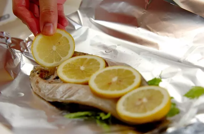 ・アルミホイルに手でちぎったセロリの葉、ホッケ、レモンを順にのせ、アサリ、プチトマト、ニンニクを散らし、タイムをのせる。同様にもう1個作る。
