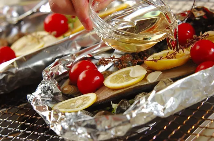 1、焼く直前に白ワインを入れ、アルミホイルを閉じて網の上にのせ、10分程蒸し焼きにする。仕上げにEVオリーブ油をまわしかける。