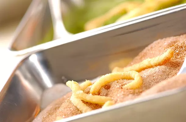 長いまま数本を束ねてねじって揚げれば、テレビで話題になった「うどんチュロス」にもなります!お好みで七味唐辛子やゆず風味の砂糖など、いろんな味を楽しんでください。