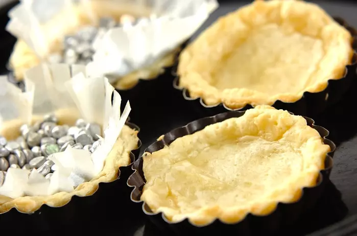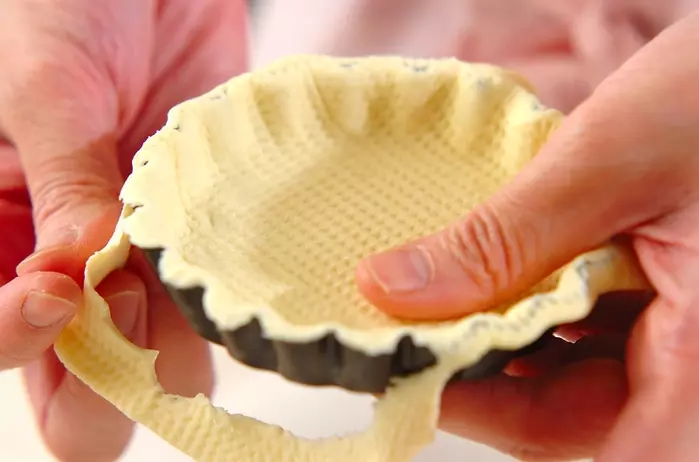 1、冷凍パイシートは型の大きさに合わせてめん棒でのばし、型に敷き込む。