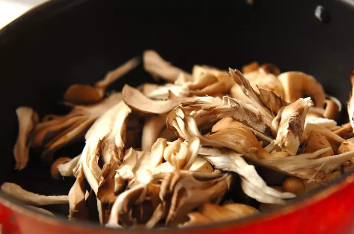 3、キノコはオリーブ油をひいたフライパンで炒め、分量外の塩コショウをする。
