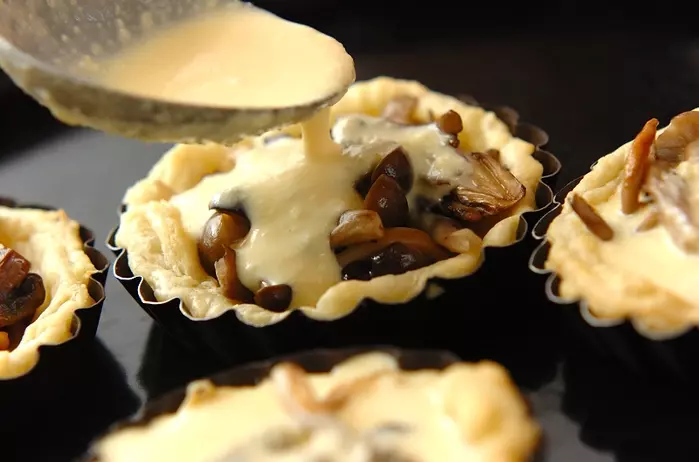 4、焼けたパイからオーブンシートと重しをはずし、キノコと<卵液>を流し入れ、180℃に予熱しておいたオーブンで15分焼く。