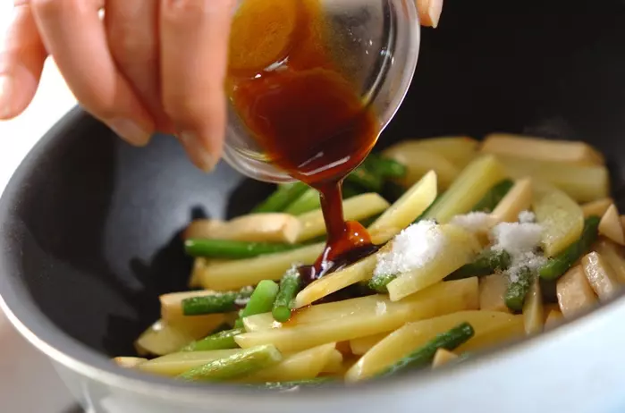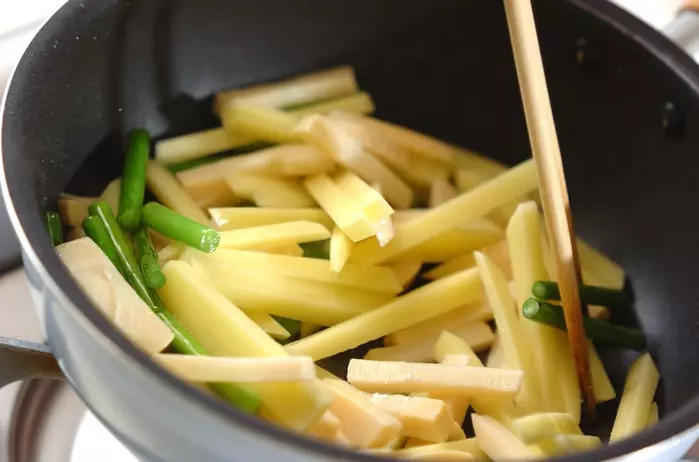 1、フライパンにサラダ油を強火で熱し、ニンニクの芽を炒める。鮮やかな緑になったら、ジャガイモ、水煮タケノコを加えて炒め合わせる。