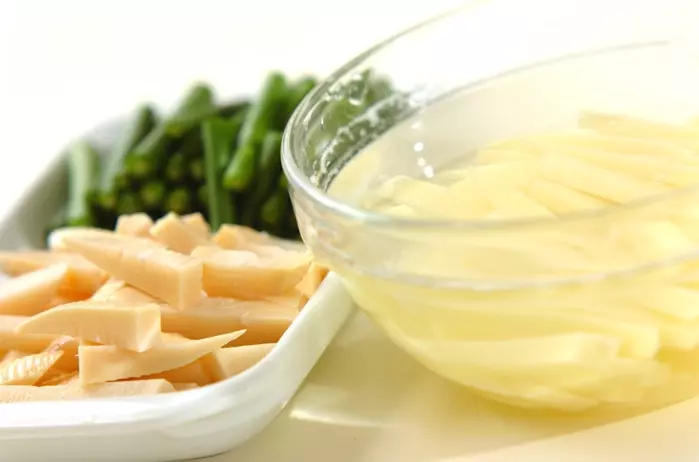 ・水煮タケノコはニンニクの芽位に切る。