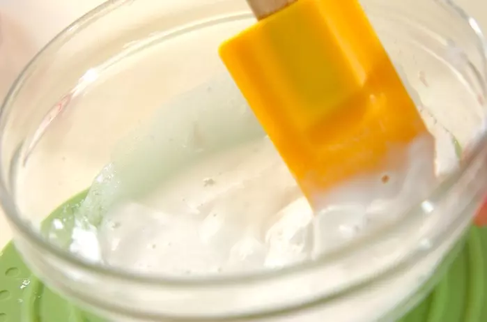 1、ボウルに上新粉、砂糖、水を入れて混ぜる。ラップをして電子レンジで1分加熱し、よく混ぜる。