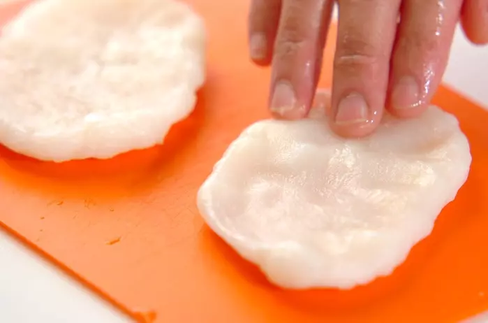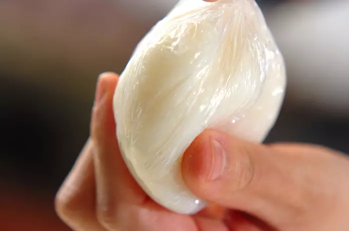 2、さらに電子レンジで2分加熱し、ラップの上に取り出してこしが出るまでもみ込み、粗熱を取る。