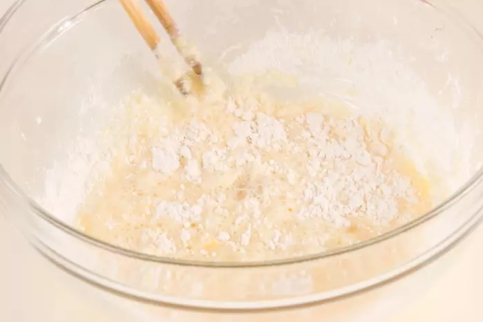 ・<衣>をサッとダマが残るくらい混ぜ合わせる。