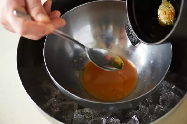 2) 氷を入れたボウルの上にさらにボウルを重ね、事前にとっておいた果汁と(1)のオイルを入れて混ぜる(※にんにくは抜く)。