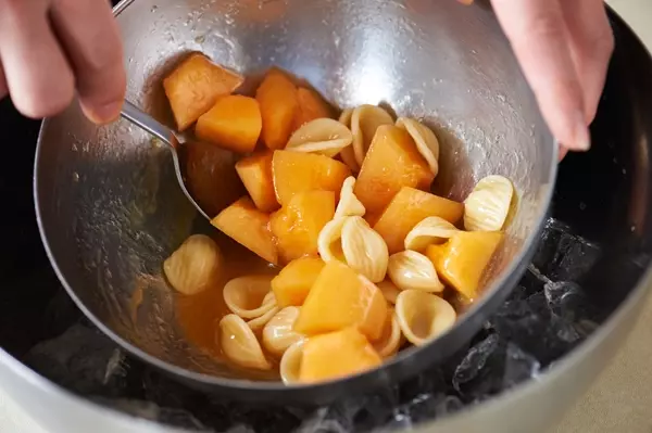 3) ざく切りにしたメロンを入れて混ぜ、味をみて塩を適量加え、さらにパスタを入れて軽く和える。