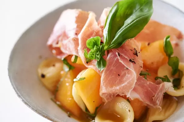 メロンの果汁感を活かしたシンプルな料理です。にんにくとパスタ以外は火を入れていないので、フレッシュな果汁感をたっぷり備えつつ、スパイスやハーブを巧みに効かせてあるため、料理としての味のまとまりも抜群。生ハムの適度な塩分でお酒もすすみます。
