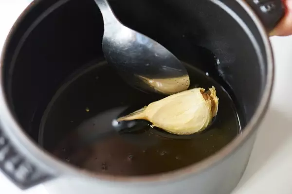 1) 鍋にオリーブオイル60cc、にんにくを入れて弱火にかけ、香りがつくまで炒める。