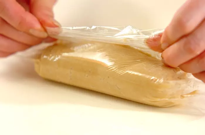 バターは小さな角に切る。ホットケーキミックスにバターを指先でつぶしながら混ぜ合わせる。ポロポロになってきたら、メープルシロップを加えさらに混ぜ合わせる。ひとつにまとまったら直径3cmの棒状に形を整えてラップで包み、冷蔵庫で20分寝かす。