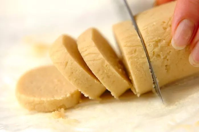 1、生地を厚さ5mmに切り、弱火で熱したフライパンにクッキーを並べ、両面焼き色がつくまで焼く。
