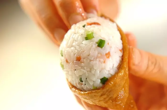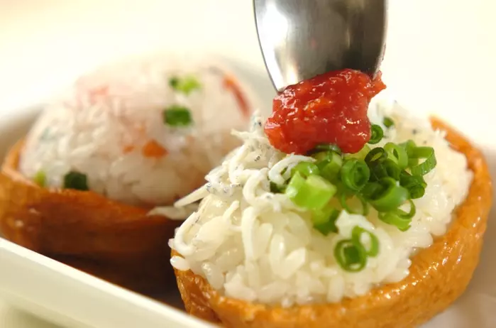 2、もう1つのご飯はラップで俵型ににぎり、油揚げの中に詰めて<梅しらすいなり/トッピング用1>の材料をその上に彩りよくのせる。