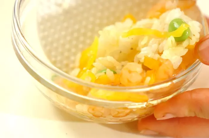 ・むきエビは分量外のお酒少々をかけ、耐熱容器に入れてラップをし、電子レンジで1分30秒加熱して火を通す。(ヒント)電子レンジは600Wを使用しています。