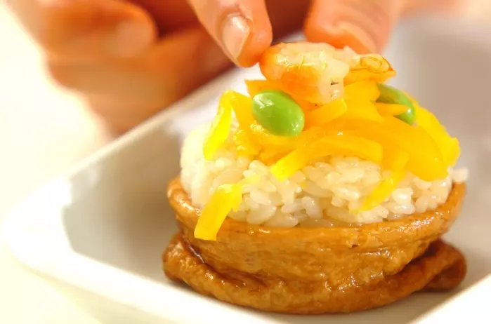 4、もう1つのご飯はラップで俵型ににぎり、油揚げの中に詰めて<エビ豆いなり/トッピング用2>の材料をその上に彩りよくのせる。