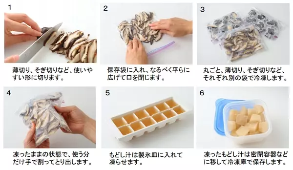 また、もどした乾しいたけは冷凍保存が可能です! 薄切りやそぎ切りなど使いやすい形に切り、それぞれ保存袋に入れて密閉し冷凍庫へ。さらに、もどし汁も冷凍可能なので捨てずに保存しましょう。製氷皿に入れて凍らせて、密閉容器などに移して冷凍しておけばいつでも便利に使えます。
