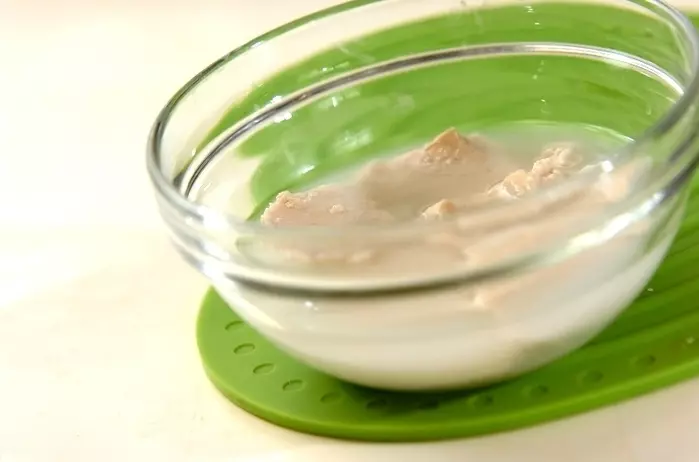3、浸しておいた酒粕のお湯を捨て、よくつぶし、(2)と混ぜ合わせ、塩で味を調える。皿に盛り、スモークサーモンを添える。