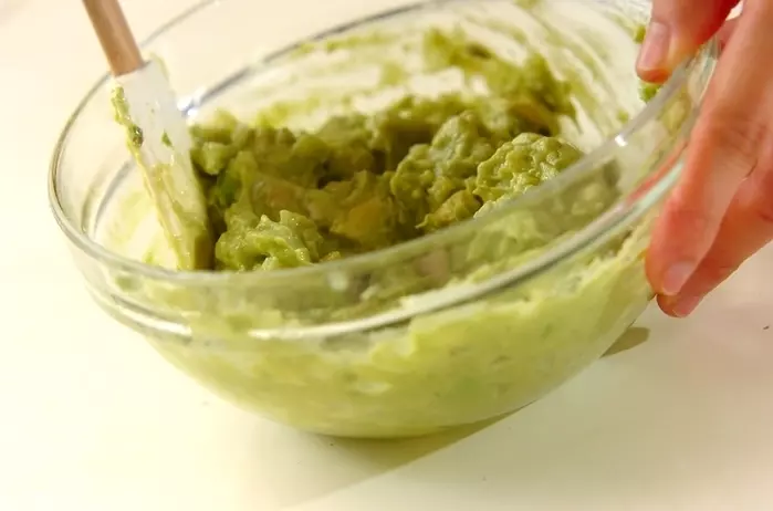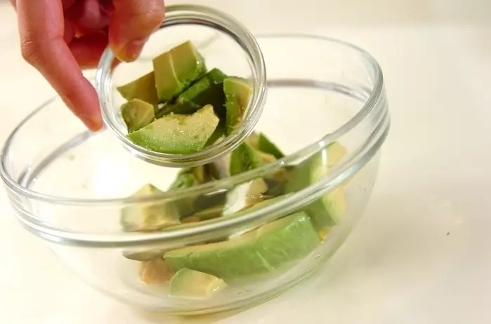 2、水気をきった玉ネギにオリーブ油とレモン汁、白みそを混ぜ合わせ、角切りにしたアボカドを加え、軽く混ぜる。