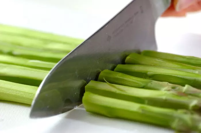 ・グリーンアスパラは根元を少し切り落とし、ハカマを取って長さを半分に切る。