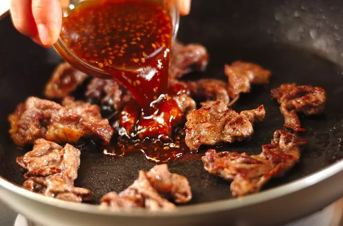 1、フライパンにゴマ油を大さじ1/2熱して牛肉を炒め、色が変わったら焼き肉のタレを加えて全体にからめる。