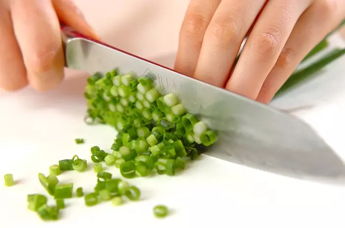 1、<ドレッシング>の材料を合わせる。細ネギは小口切りにする。