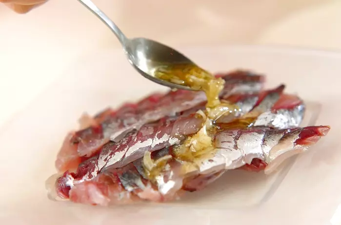 2、アジは薄切りにして器に並べ、(1)の<ドレッシング>をかけ、細ネギを散らす。
