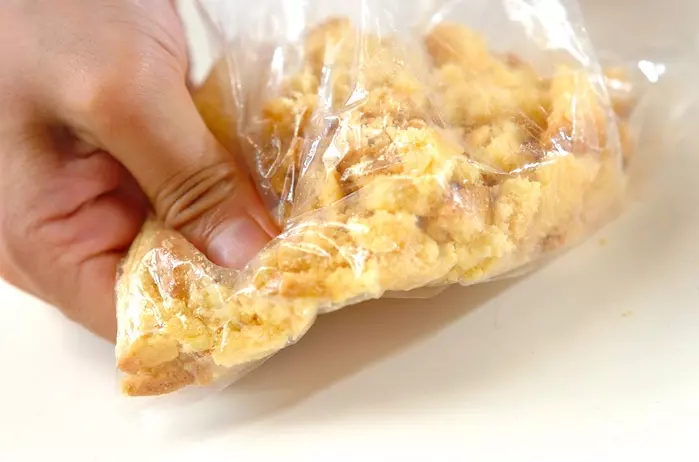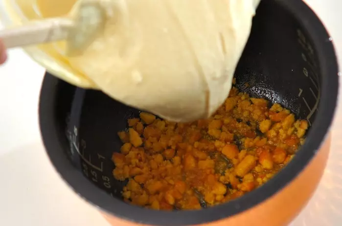 4、炊飯器の内釜に砕いたクッキー、溶かし無塩バターを加えて混ぜ合わせ、全体に広げる。(3)を流し入れ、内釜をトントンと叩いて表面を平らにし、スイッチを入れる。竹串を刺して何もついてこなければ、ケーキクーラーにのせて冷まし、食べやすい大きさに切って器に盛る。