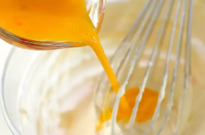 2、グラニュー糖を加えて混ぜ合わせ、溶き卵を少しずつ加えてさらに混ぜ合わせる。きれいに混ざったらレモン汁、牛乳を加えて混ぜ合わせ、バニラエッセンスも加える。