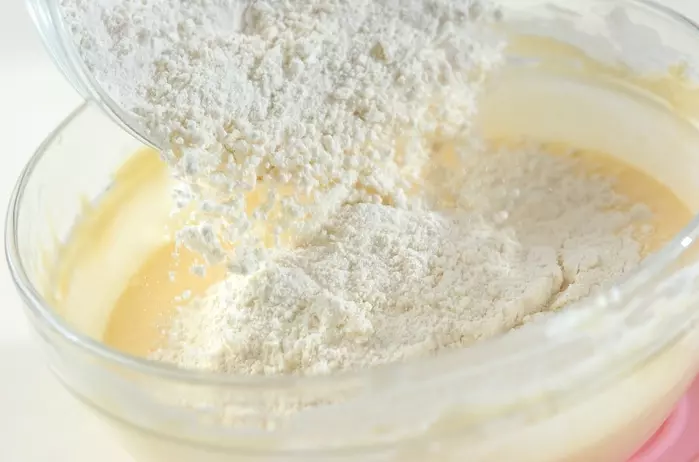3、なめらかに混ざったらホットケーキミックスを加え、粉っぽさがなくなるまで混ぜ合わせる。