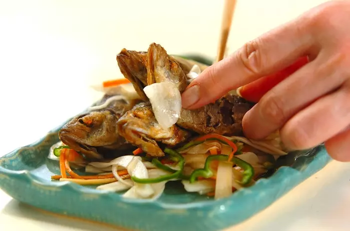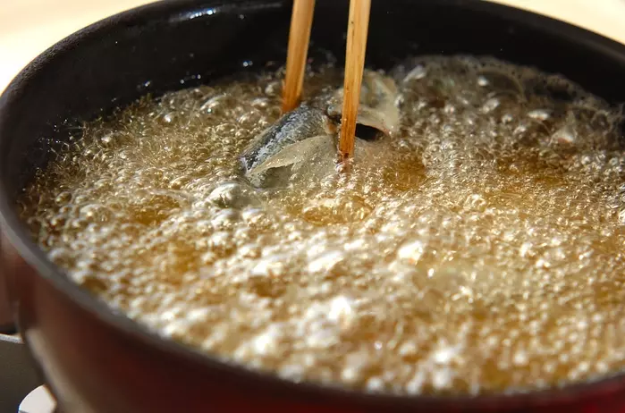 1、アジに薄く小麦粉をからめて、160℃の揚げ油に全部入れ、中火にしてゆっくり揚げる。泡が細かくなってアジがカラッと揚がったら、熱々を<南蛮ダレ>につけ、タレが全体にからまるように返す。