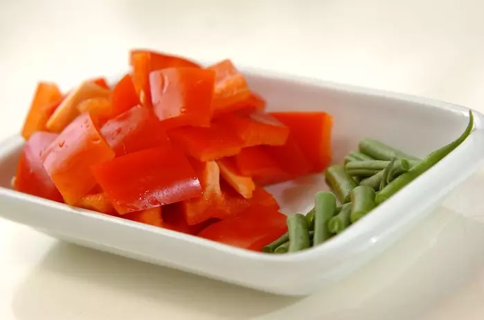 1、サヤインゲンは軸を切り落として長さ2cmに切る。赤パプリカはヘタと種を除き、2cm角に切る。