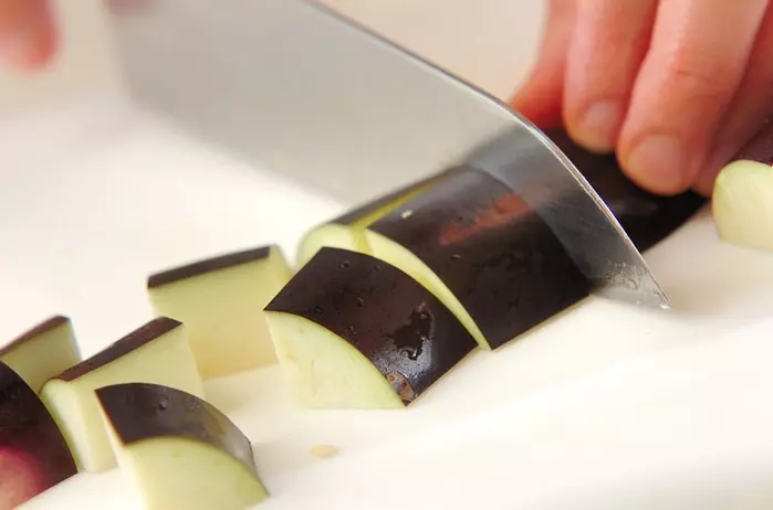 2、玉ネギは2cm角に切る。プチトマト、ナスはヘタを除き、2cm角に切る。